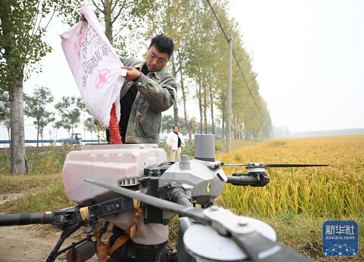 10月30日,在河南省清丰县固城镇张庄里村,农户在操作无人巡田机起飞。